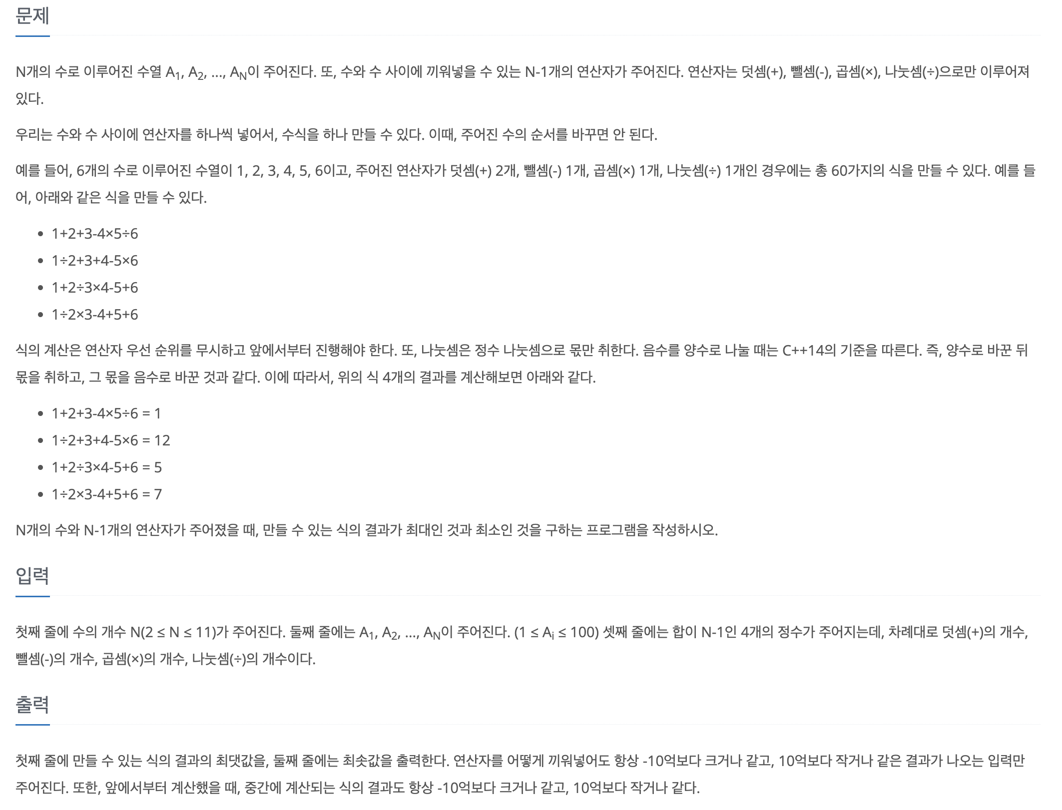 연산자는 최대 N-1(=10)개가 있고, 10! = 3628800이므로 시간 제한도 넉넉하다.
