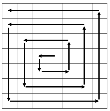 - 홀수 길이의 2차원 배열의 중심에서 시작하여 방향을 바꾸며 이동