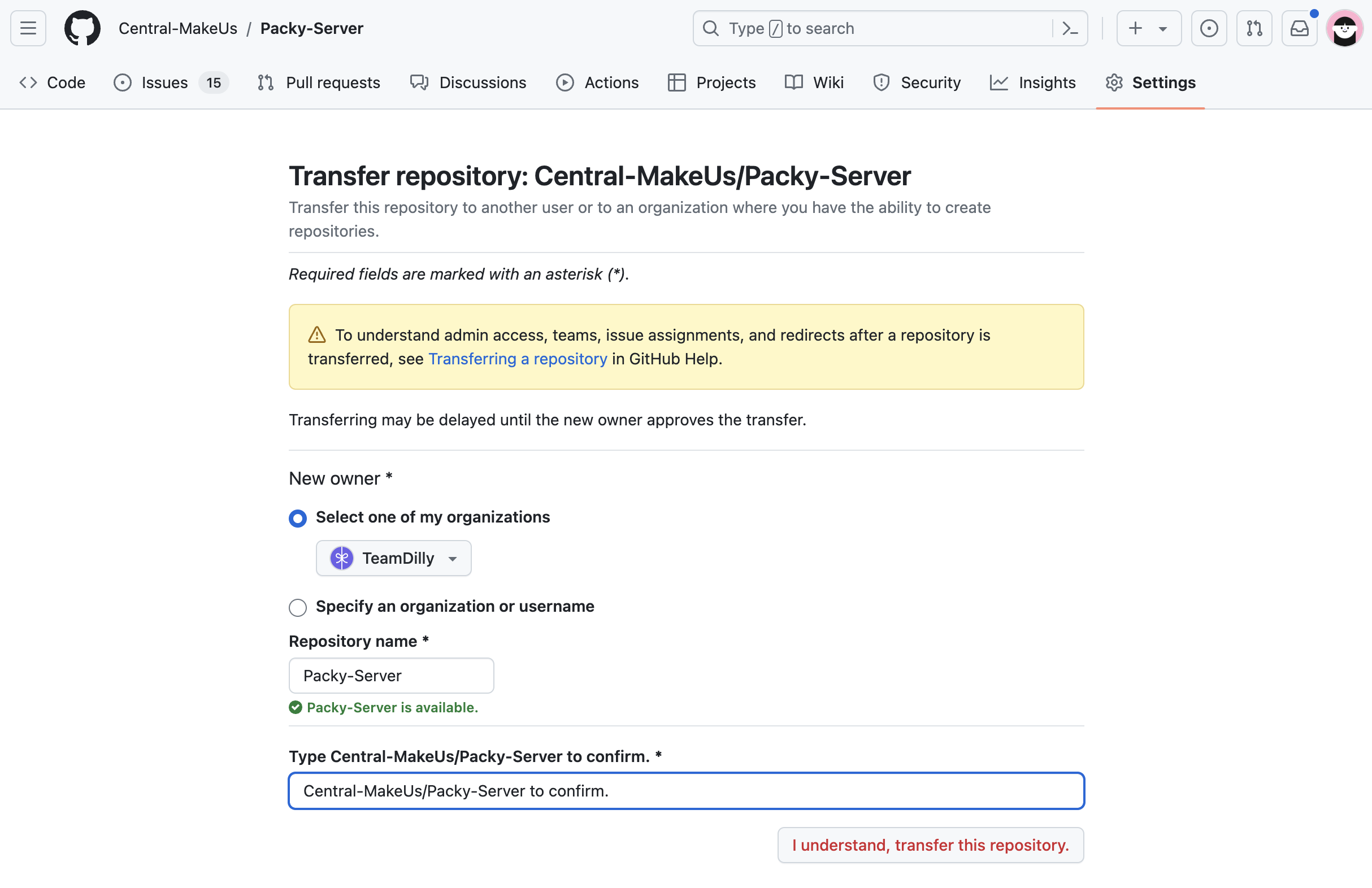 옮길 Organization과 레포 이름을 적고 하단 버튼을 누르면 된다.
