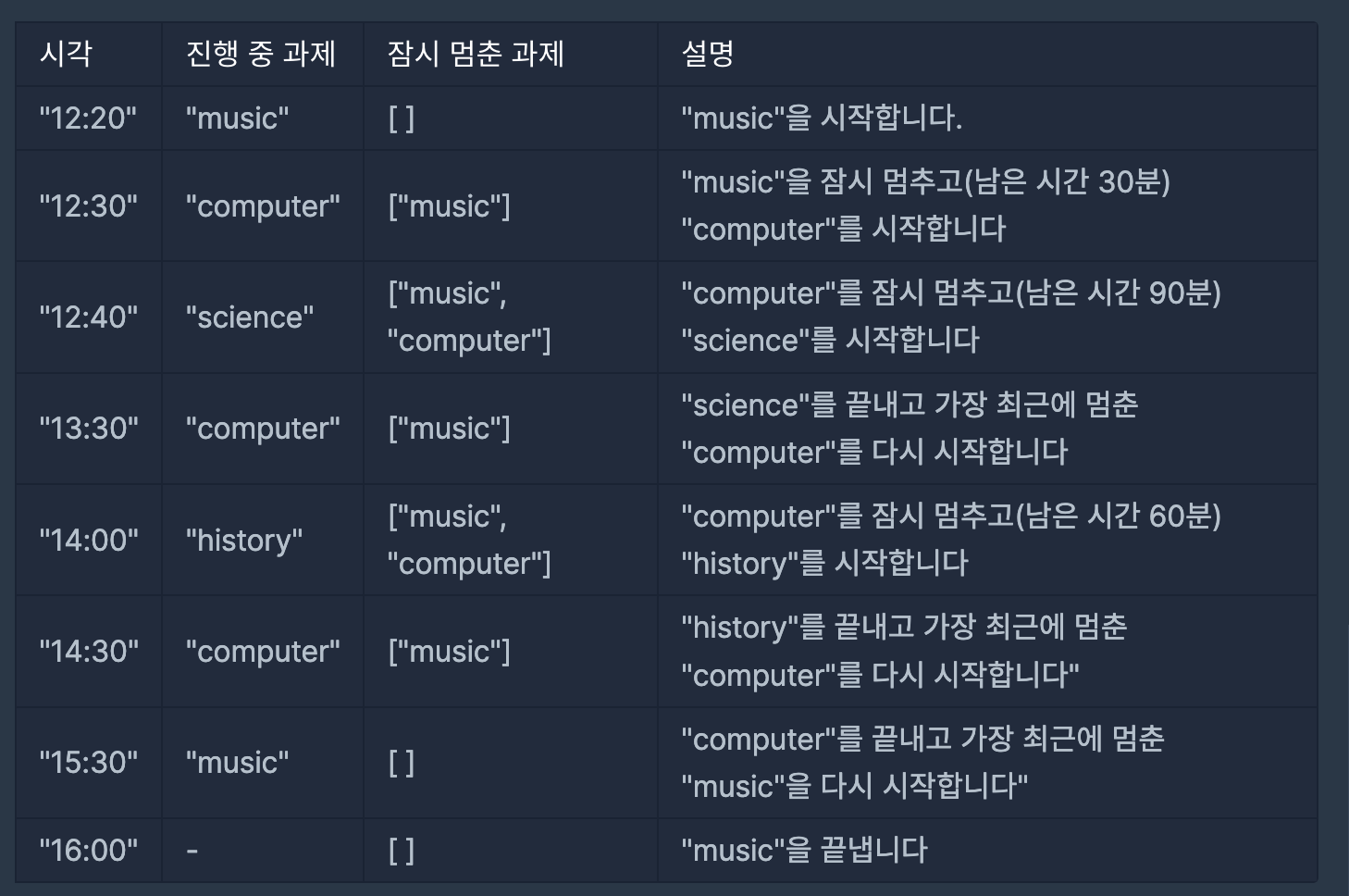입출력 예제에 있는 표를 통해 잠시 멈춘 과제를 스택으로 구현해야 한다는 힌트를 얻을 수 있었다. (최근에 멈춘 과제를 먼저 하므로, 선입후출)