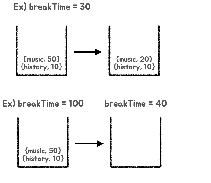 - breakTime < leftTime: 쉬는 시간을 전부 사용했지만, 해당 과목을 끝내지 못함