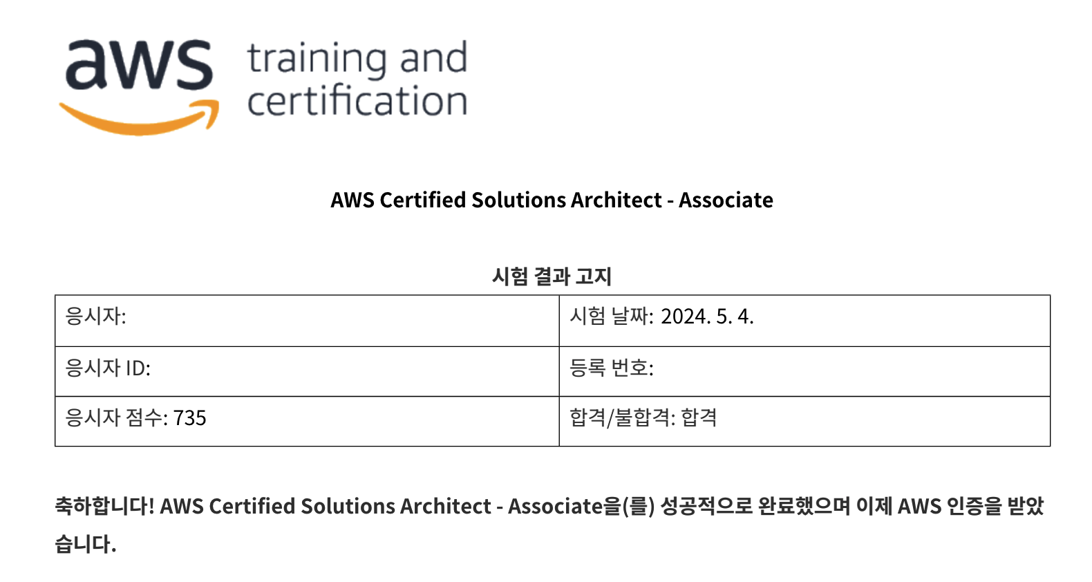 토요일 19시쯤 시험이 끝났고, 다음날 새벽 3시에 합격 메일이 왔다.