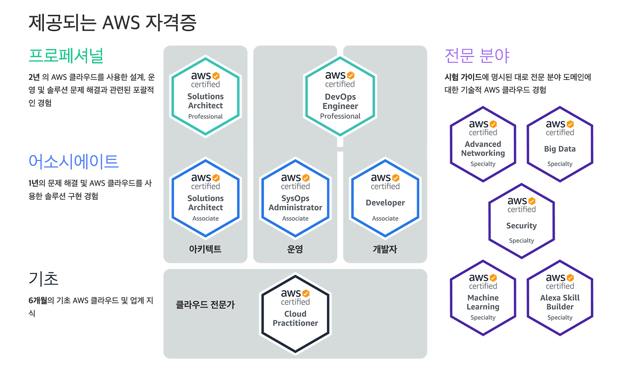 아키텍트 / 운영 / 개발로 영역이 구분되어 있으며, 난이도는 기초 / 어소시에이트(Associate) / 프로페셔널(Professional)로 이루어져 있다.