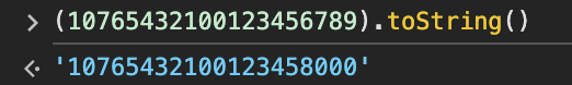 자바스크립트에서 정수의 표현은 53비트로 제한되어 있어, 아래 콘솔 결과처럼 뒷 숫자의 정확도를 잃을 수 있다.