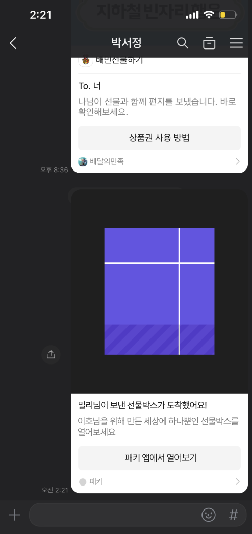 - 선물박스를 받은 유저는 카카오톡에서 '패키 앱에서 열어보기' 버튼을 눌러 선물박스를 앱에서 확인할 수 있다.