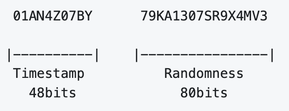 48bit의 Timestamp(UNIX Time, 밀리초 단위)와 80bit의 랜덤 문자열로 이루어져 있다.