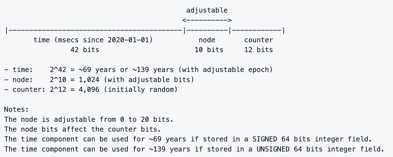 초당 생성 가능한 ID 수도 약 4,096,000개로 넉넉하며 타임스탬프를 앞 쪽에 배치하여 시간 순 정렬도 가능하다.