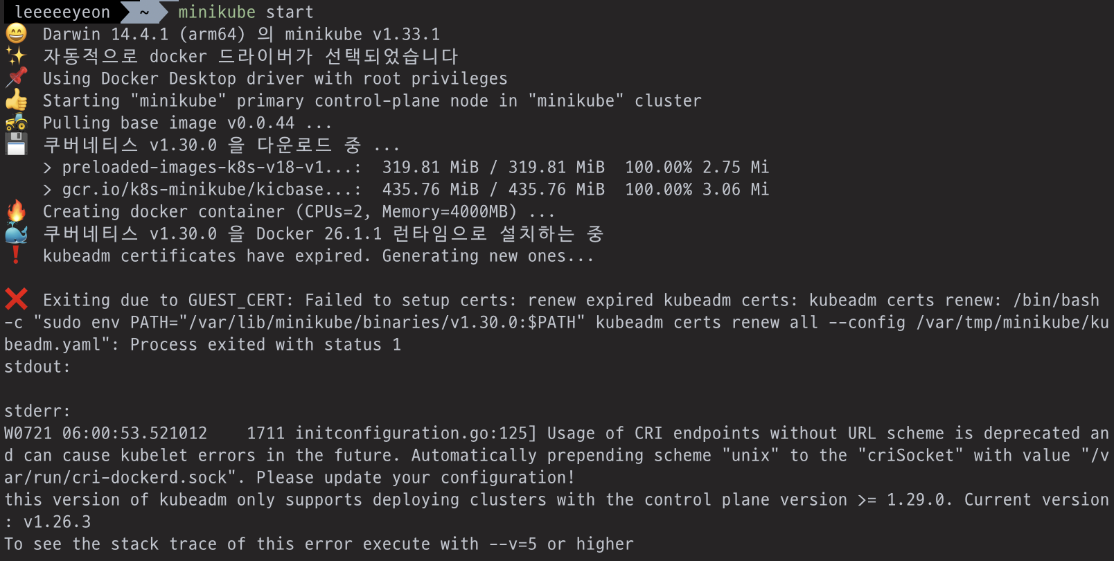 쿠버네티스 실습을 위해 minikube를 실행하려고 했는데 위와 같이 실패하였다.