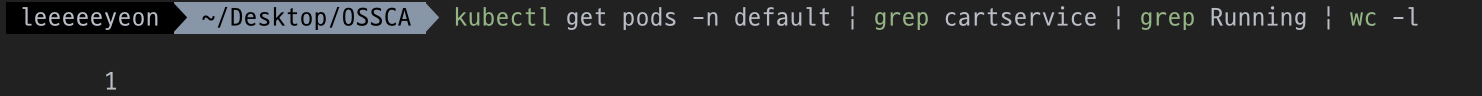 'kubectl get pods -n default | grep cartservice | grep Running | wc -l' 명령어의 결과가 0보다 크다는 의미이다.
