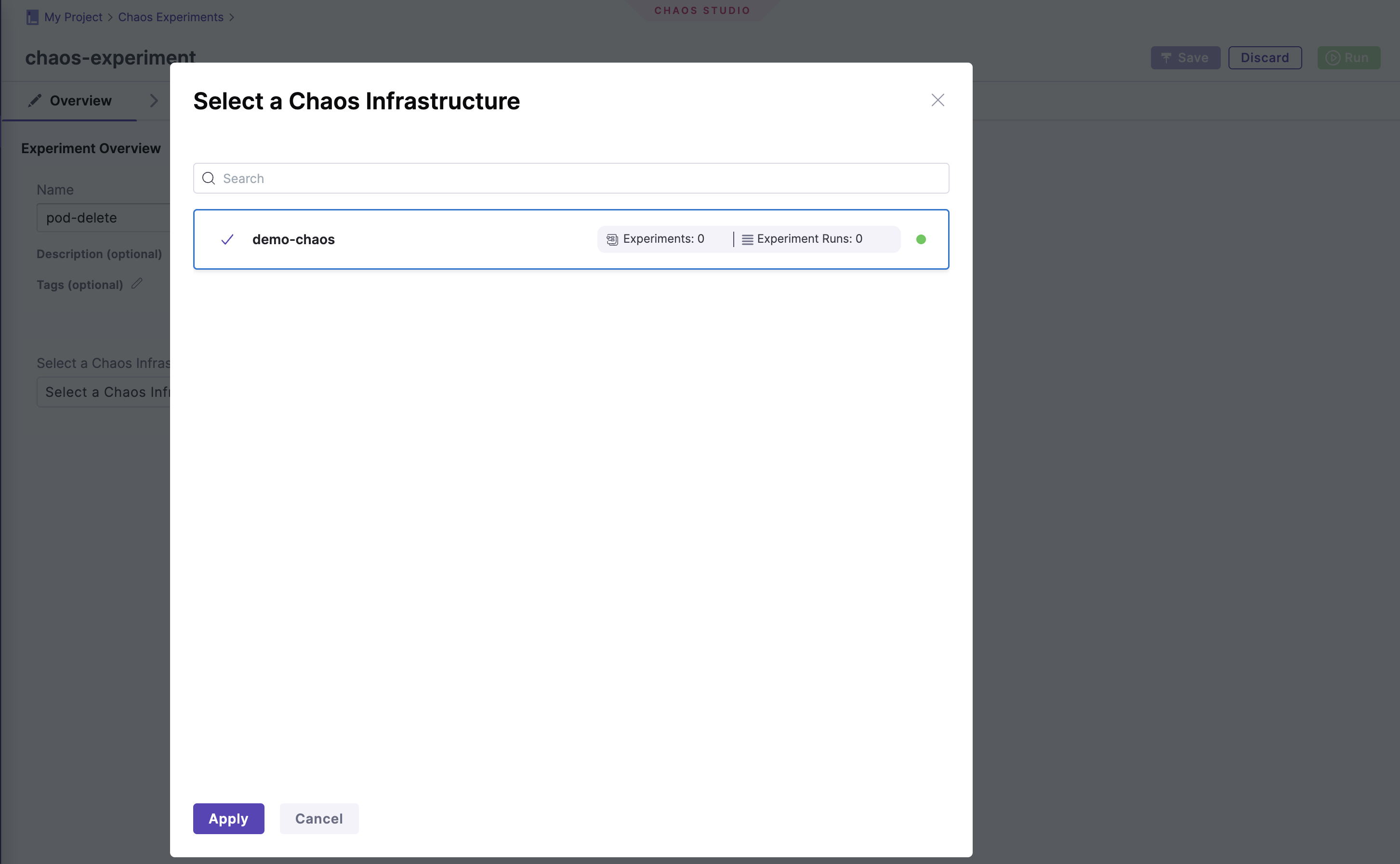 4번 과정에서 생성한 Chaos Infrastructure를 선택한다.