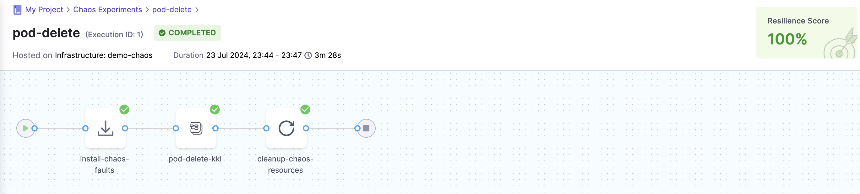 Install-chaos-faults와 cleanup-chaos-resources 단계가 갑자기 추가되었는데, 카오스 실험에 필요한 리소스들을 설치하고 실험이 종료된 뒤 다시 삭제하는 단계인 것 같다.
