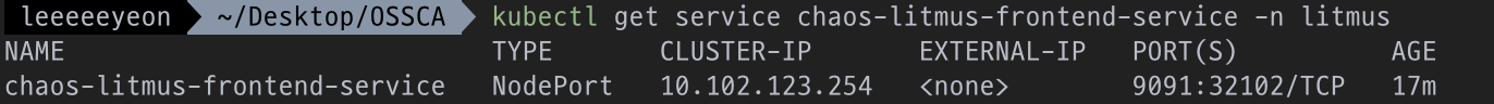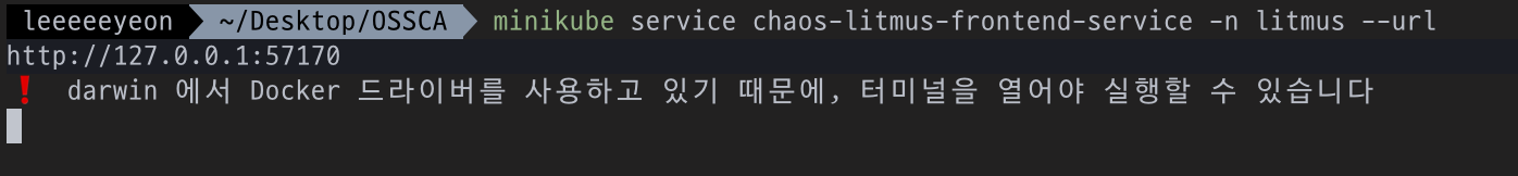 아래 명령어를 입력하여 나온 URL로 Chaos Center(LitmusChaos 관리 페이지)에 접속할 수 있다.
