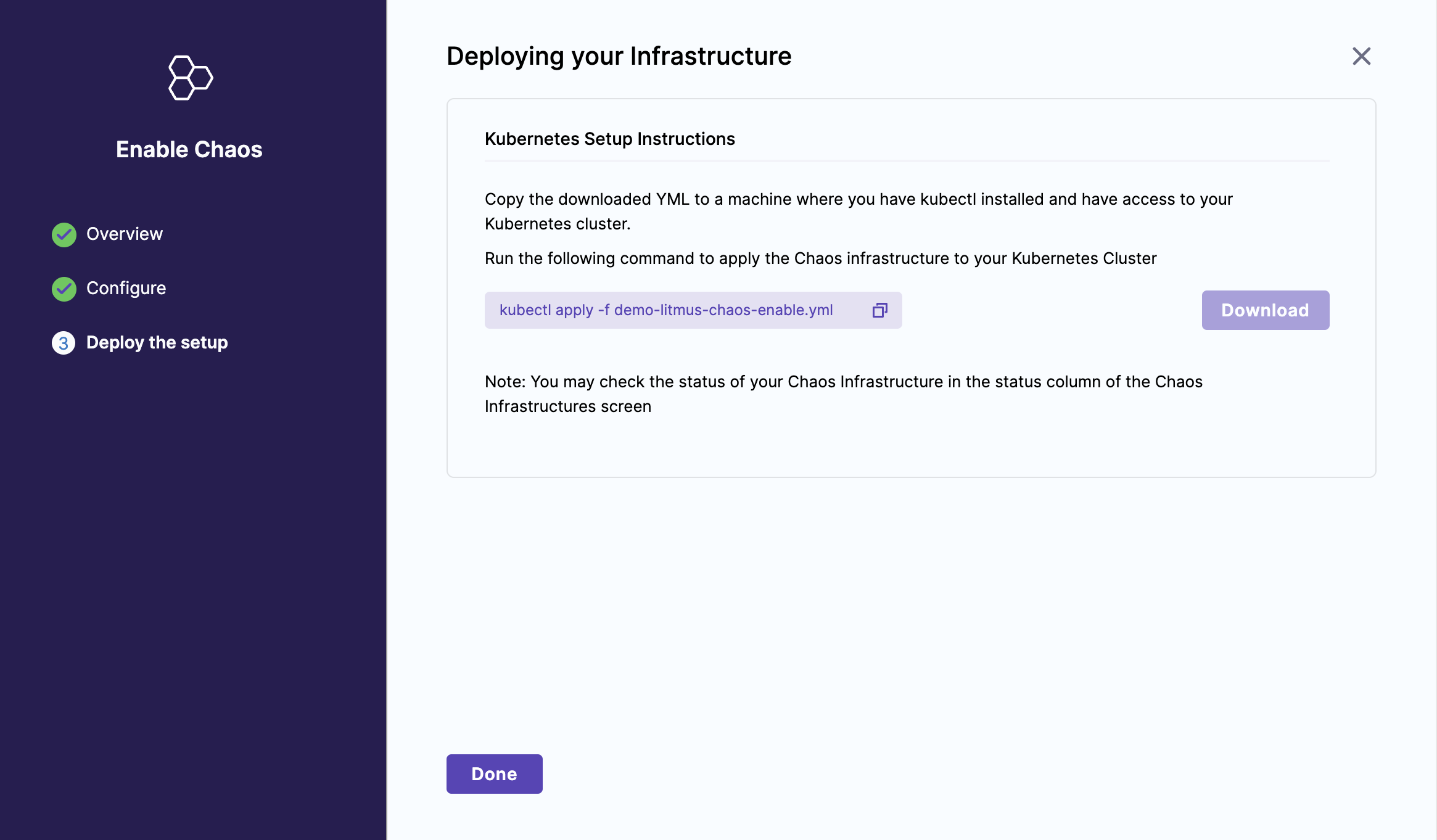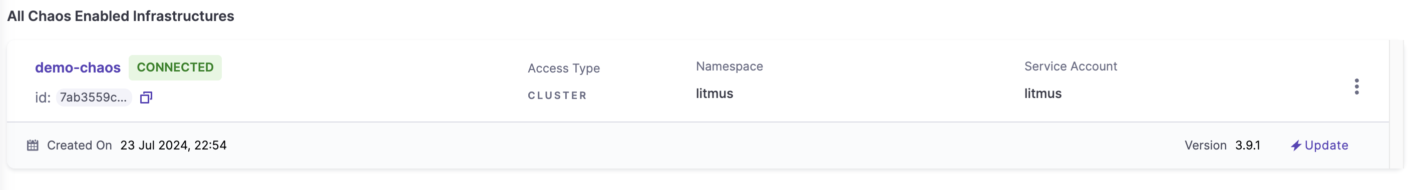 위 과정까지 성공적으로 수행하면 Pending 상태였던 Chaos Infrastructure가 Connected 상태로 변한다.