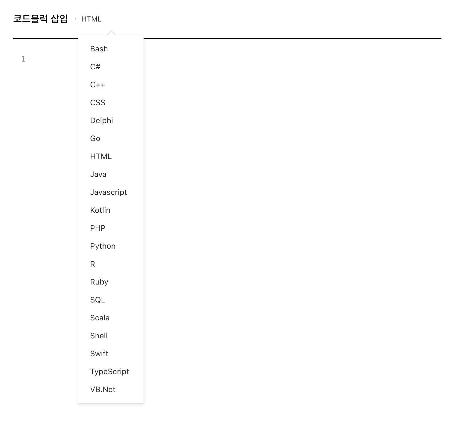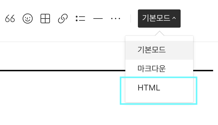 다음으로 상단 바 제일 오른쪽에 포스트 모드(기본모드/마크다운/HTML) 중 HTML을 선택한다. 내가 적은 코드 블럭이 대충 보일 것이다.