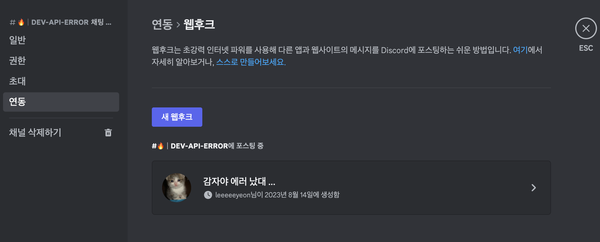 그렇기 때문에 팀 내 커뮤니케이션 툴인 디스코드로 API 에러가 발생할 때마다 알림이 올 수 있도록 환경을 구축해보았다!