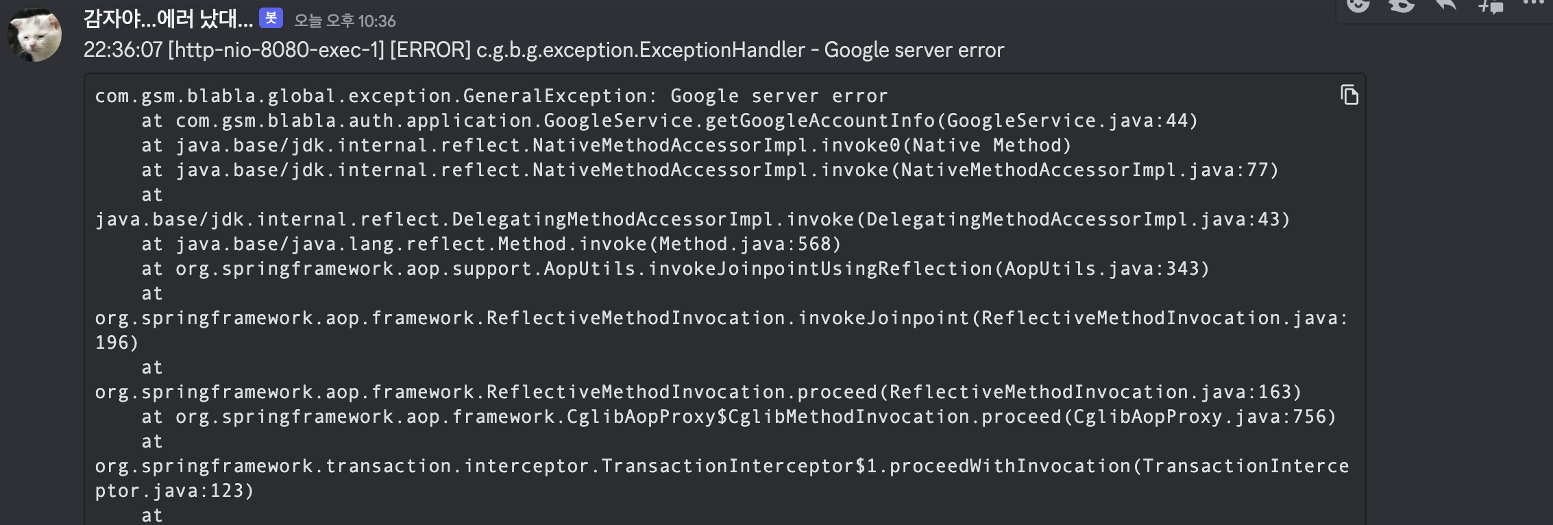 해당 방법을 도입하기 전에는 ExceptionHandler에 디스코드 메시지 출력 코드를 그대로 넣어서 계속 에러가 났었다 😢