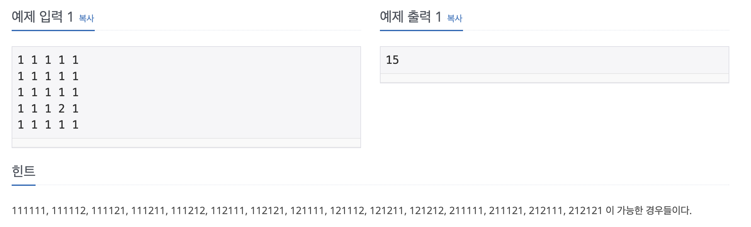 111111, 111112, 111121, 111211, 111212, 112111, 112121, 121111, 121112, 121211, 121212, 211111, 211121, 212111, 212121 이 가능한 경우들이다.