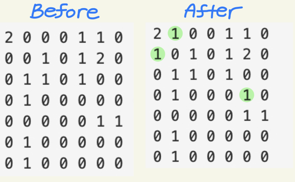 초록색으로 표시된 1이 새로 세운 벽을 의미한다. 위 사진은 경우의 수 중 하나로, 다음 경우의 수를 탐색할 때는 초록색 1 중 하나를 허물고 새로운 자리(0)에 벽(1)을 세워야 한다.