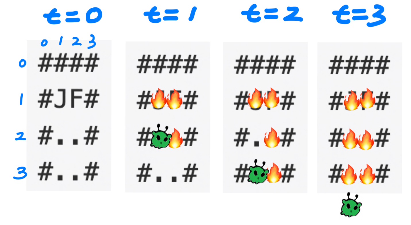 아래 사진은 시간별 지훈이(왹깅)와 불(🔥)의 위치를 나타낸 그림이다.
