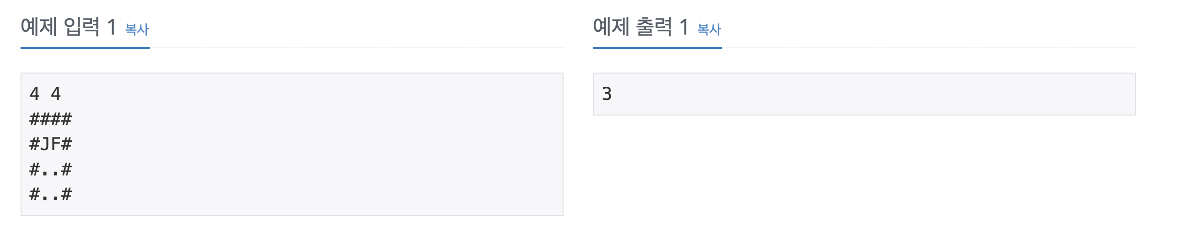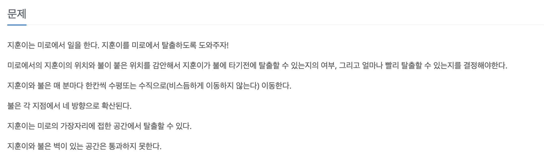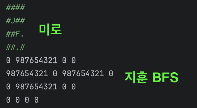 하지만 지훈이와 불을 동시에 움직이는 코드를 적는 것이 어려웠고, 결국 다른 사람의 풀이를 참고하여 문제를 풀 수 있었다. 🥲