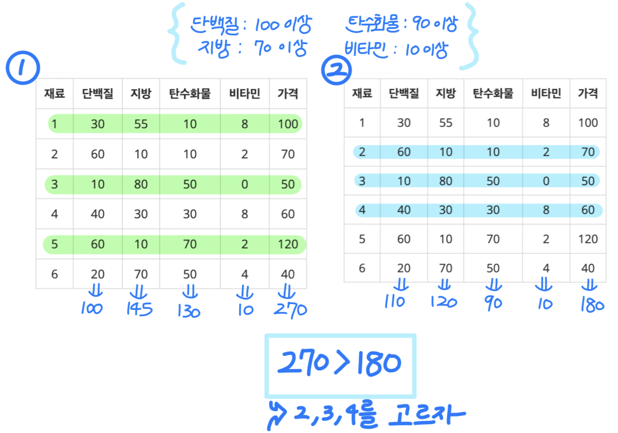 둘 다 최소 영양성분 100, 70, 90, 10 이상을 만족하지만 총 가격은 1번이 270, 2번이 180으로