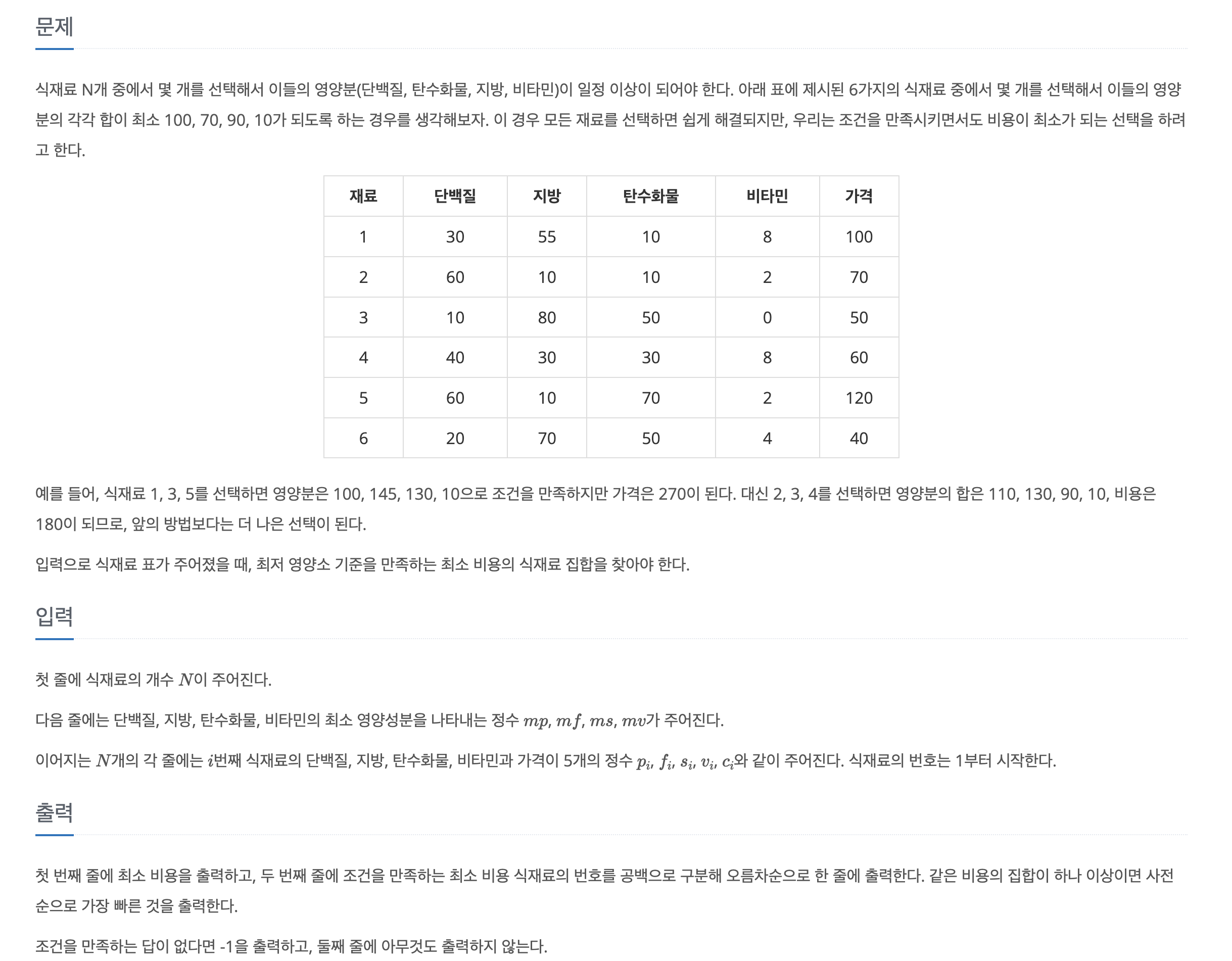 식재료 N개 중에서 몇 개를 선택해서 이들의 영양분(단백질, 탄수화물, 지방, 비타민)이 일정 이상이 되어야 한다. 아래 표에 제시된 6가지의 식재료 중에서 몇 개를 선택해서 이들의 영양분의 각