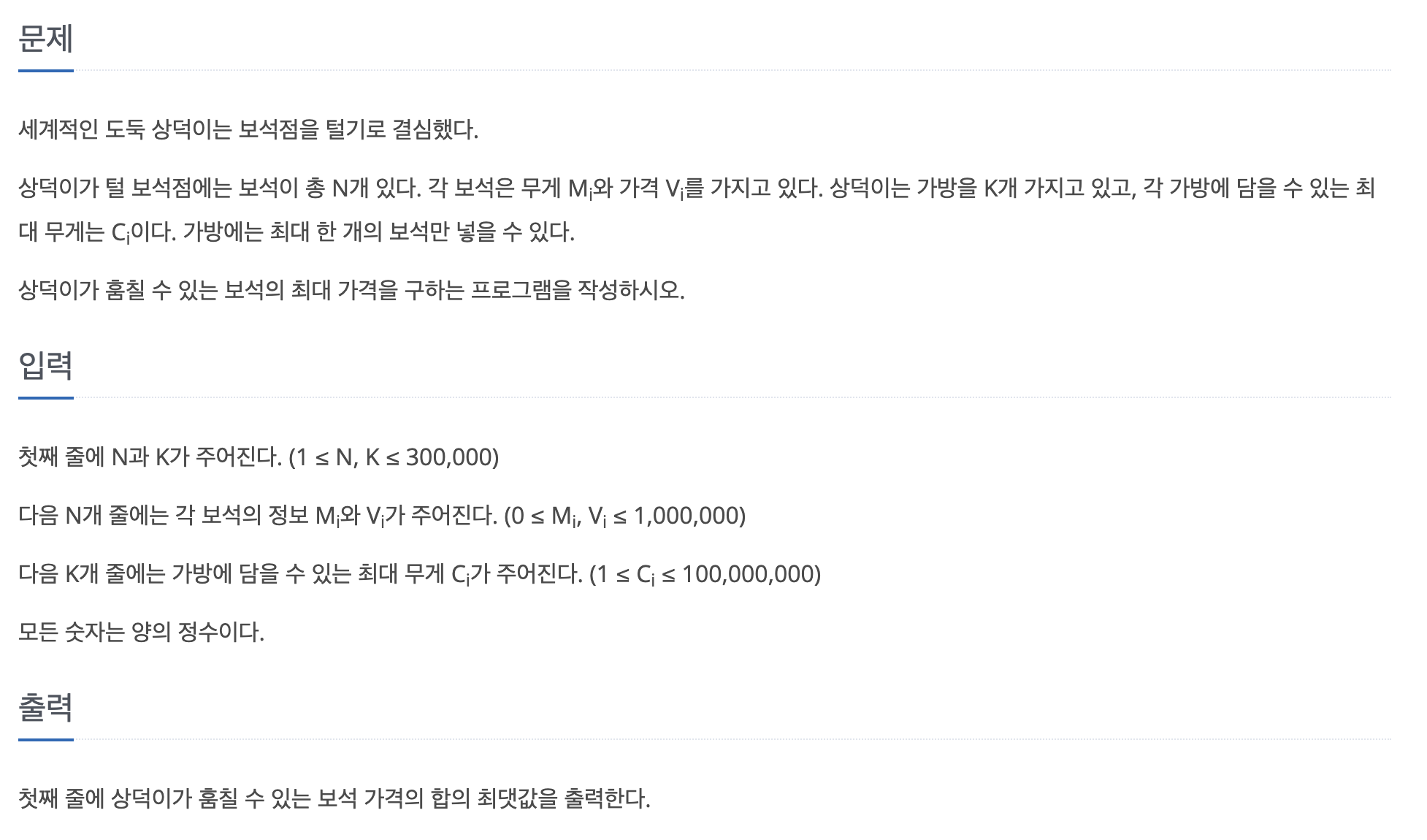 vector<pair<int, int>> v; // {보석 가격, 무게}