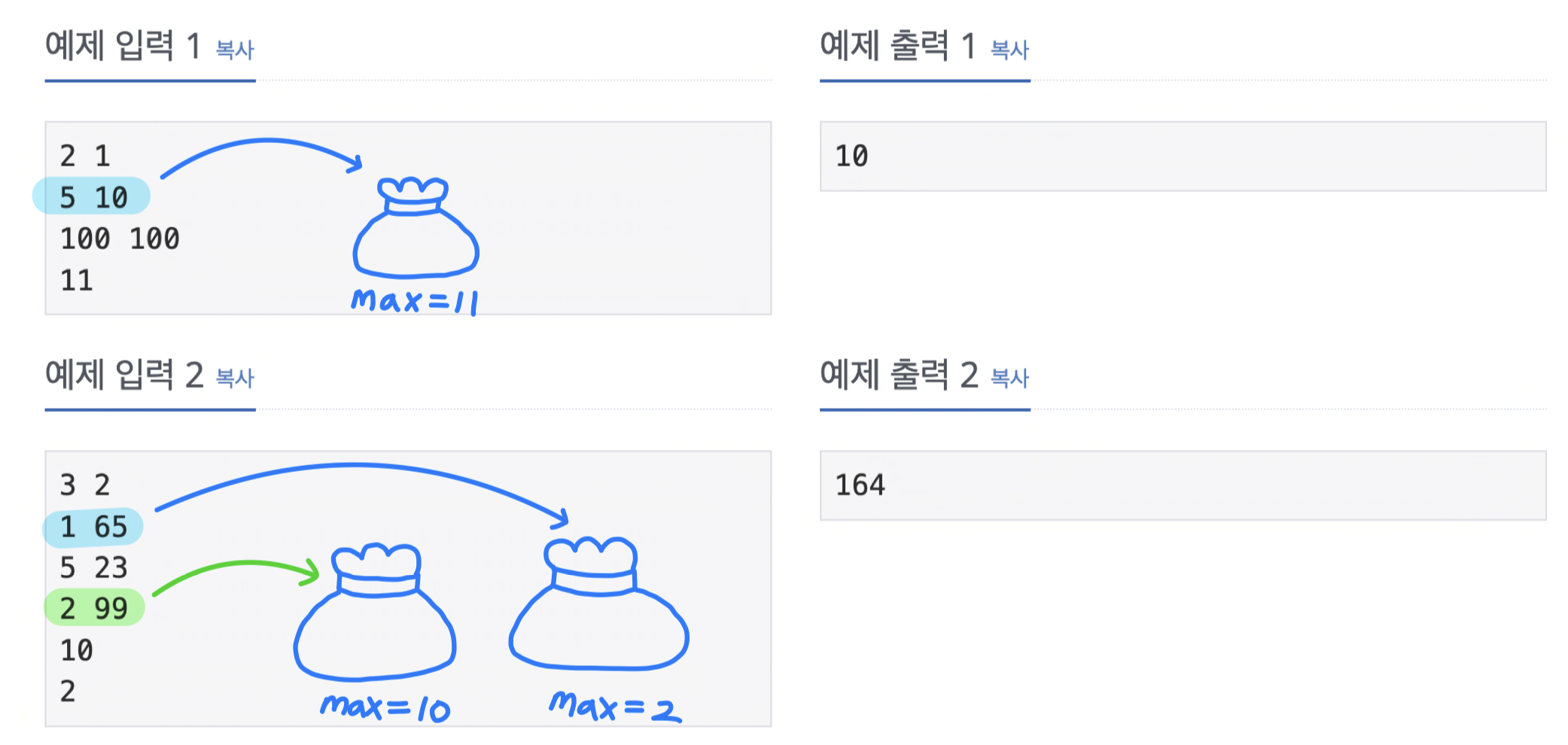 💡 보석을 가격이 높은 순으로 정렬, 가방은 무게가 작은 순으로 정렬하고 비싼 보석부터 차례대로 가방에 담는다