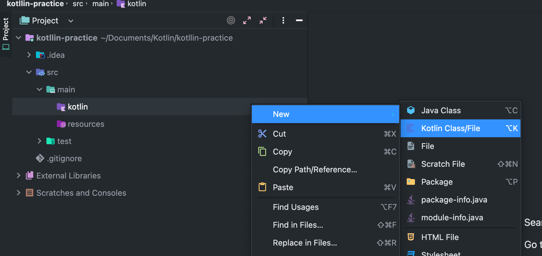 src/main/kotllin 디렉토리에 파일을 생성한다.