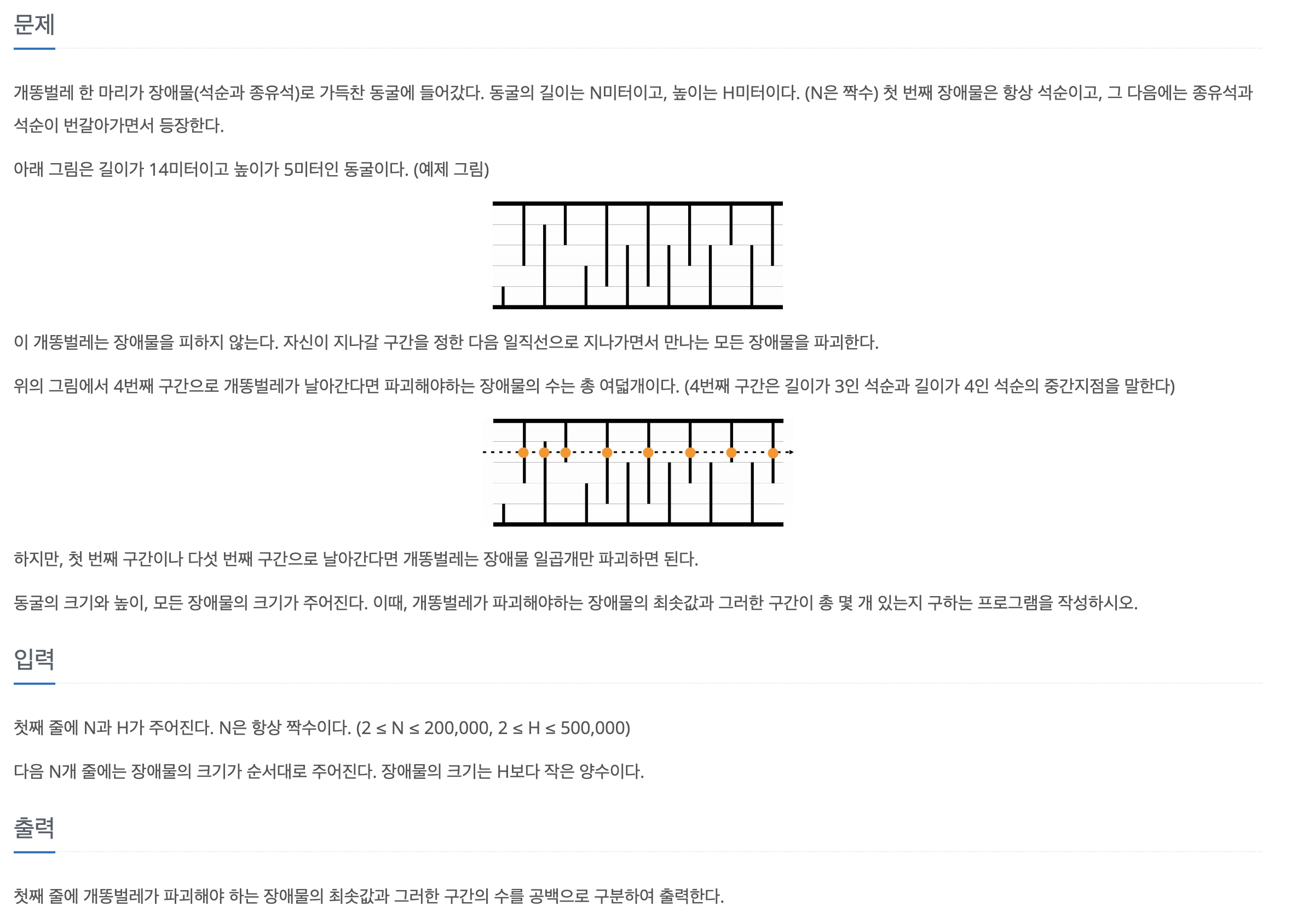 개똥벌레 한 마리가 장애물(석순과 종유석)로 가득찬 동굴에 들어갔다. 동굴의 길이는 N미터이고, 높이는 H미터이다. (N은 짝수) 첫 번째 장애물은 항상 석순이고, 그 다음에는 종유석과 석순이