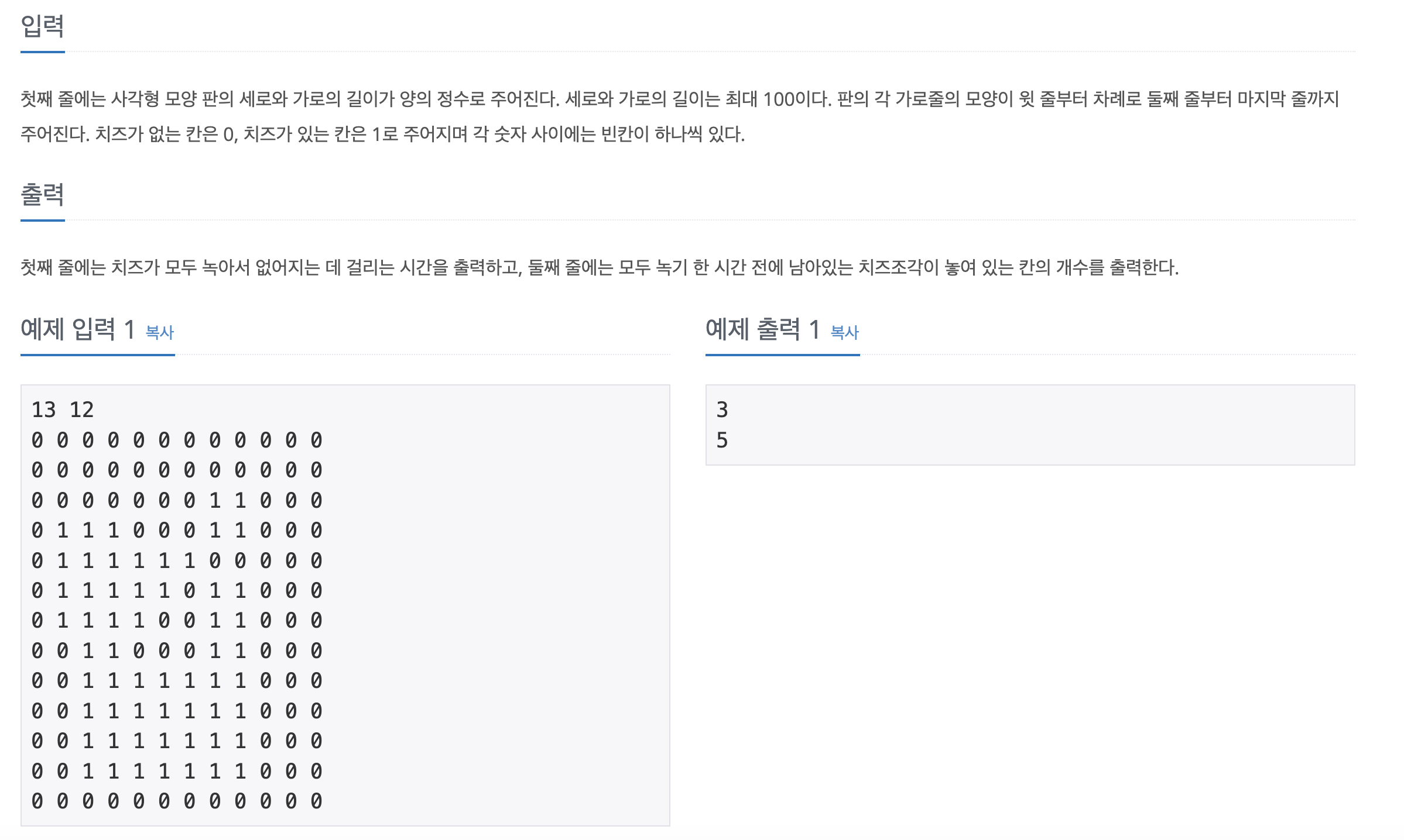 - 위 과정을 판에 1인 칸이 남아있지 않을 때까지 1~3번 과정을 while문으로 반복한다. while문을 돌 때마다 t를 1씩 더해줘서 시간을 count하고, 치즈 조각의 개수를 갱신하여 가장 마지막에 남은 치즈 조각의 개수를 저장한다.