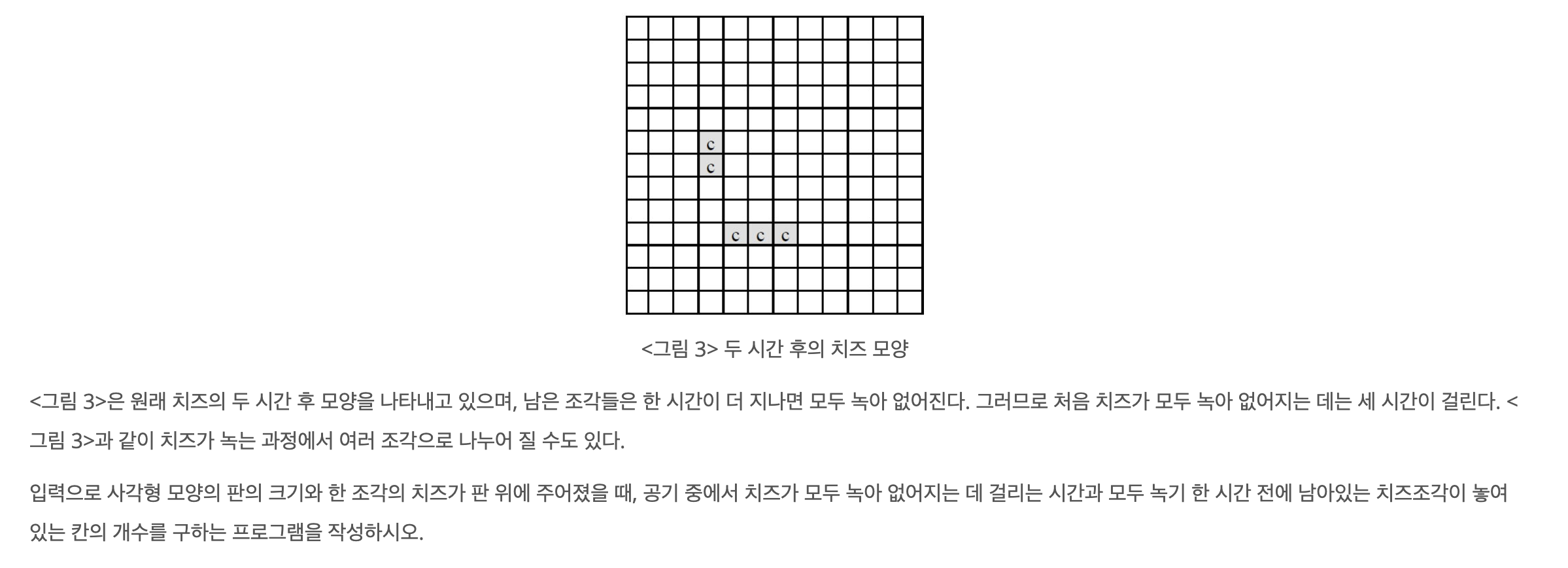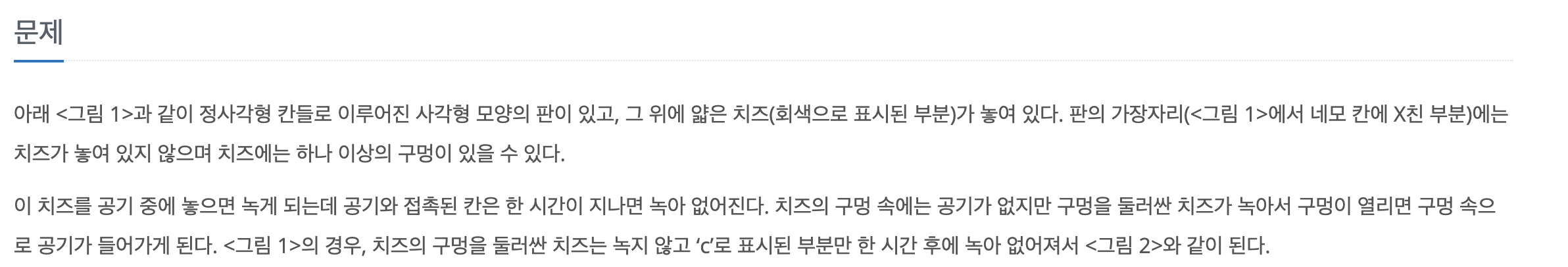 아래 <그림 1>과 같이 정사각형 칸들로 이루어진 사각형 모양의 판이 있고, 그 위에 얇은 치즈(회색으로 표시된 부분)가 놓여 있다. 판의 가장자리(<그림 1>에서 네모 칸에 X친 부분)에는 치즈가 놓