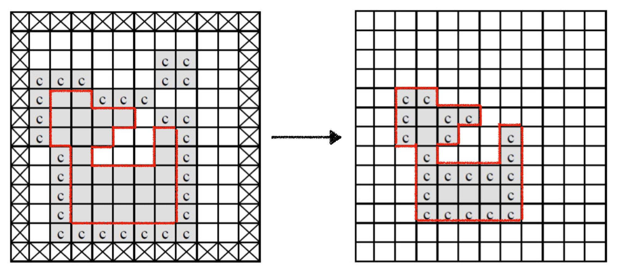 아래 그림과 같이 c로 표시된 부분은 녹아서 빈 칸이 되고, 빨간색으로 표시한 치즈의 가장자리가 새로운 'c'가 된다.