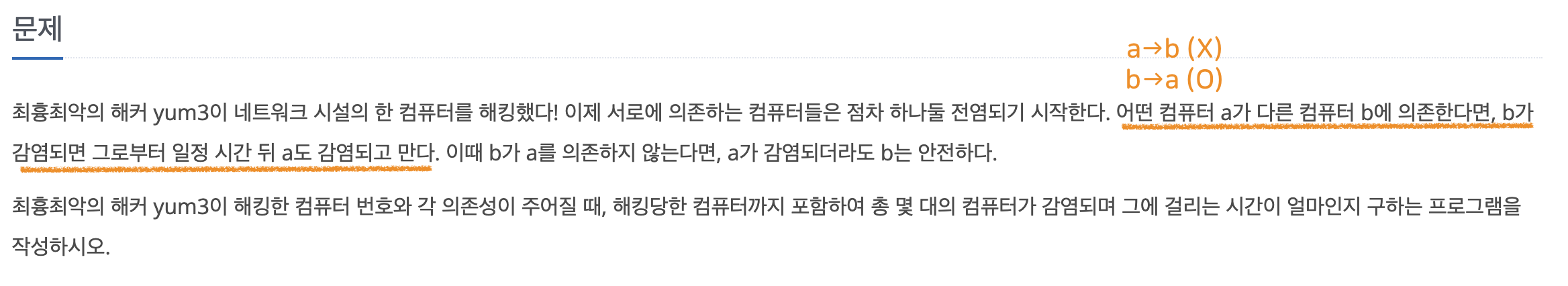 최흉최악의 해커 yum3이 네트워크 시설의 한 컴퓨터를 해킹했다! 이제 서로에 의존하는 컴퓨터들은 점차 하나둘 전염되기 시작한다. 어떤 컴퓨터 a가 다른 컴퓨터 b에 의존한다면, b가 감염되면