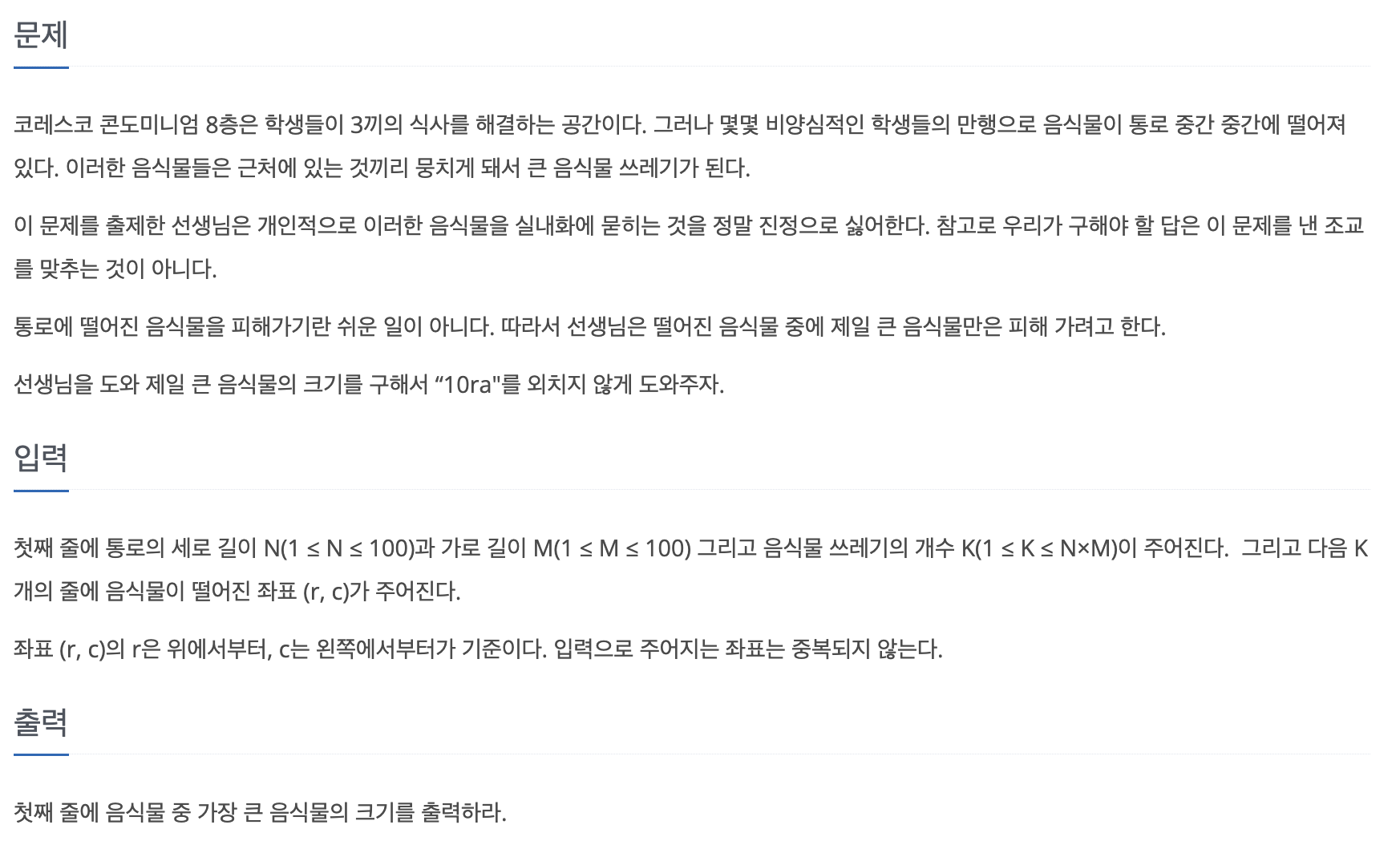 첫째 줄에 통로의 세로 길이 N(1 ≤ N ≤ 100)과 가로 길이 M(1 ≤ M ≤ 100) 그리고 음식물 쓰레기의 개수 K(1 ≤ K ≤ N×M)이 주어진다. 그리고 다음 K개의 줄에 음식물이 떨어진 좌표 (r, c)가 주어진다