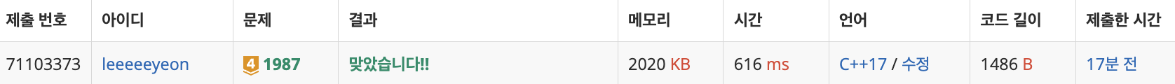 이전에 파이썬으로 푼 적이 있는 문제인데 데이터 추가로 재채점이 된 이후 시간초과로 틀린 문제 처리되어 이번에 C++로 다시 풀어보았다!