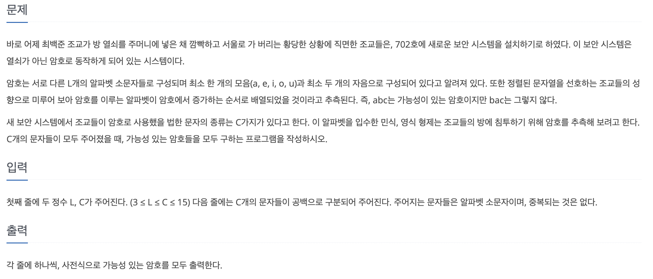 그리고 마지막에 재귀 탈출을 할 때 조건문으로 모음과 자음의 개수를 확인하여 조건을 충족(모음 1개 이상, 자음 2개 이상)하는 경우에만 암호를 출력하도록 코드를 구성하였다.