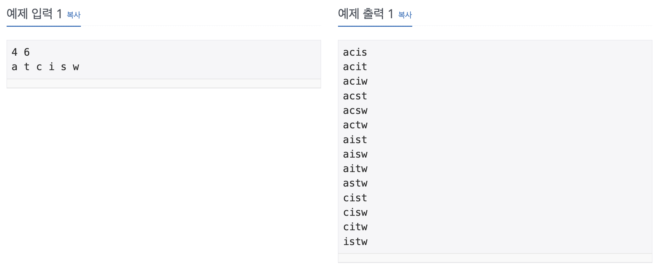 첫째 줄에 두 정수 L, C가 주어진다. (3 ≤ L ≤ C ≤ 15) 다음 줄에는 C개의 문자들이 공백으로 구분되어 주어진다. 주어지는 문자들은 알파벳 소문자이며, 중복되는 것은 없다.