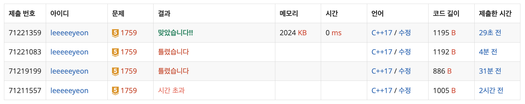 질문 게시판에 있는 반례들을 넣어봤지만 해결되지 않았다😞 다른 사람들의 블로그들을 보다 반복문에서 재귀 함수를 호출할 때의 범위가 나와 다른 것을 찾을 수 있었다.