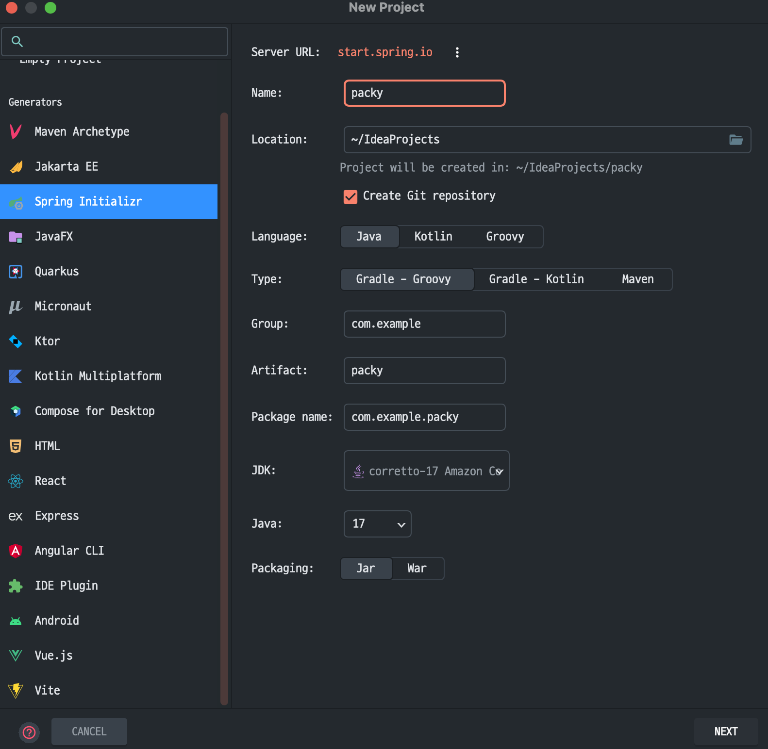 Spring Boot 버전의 경우 3.2.1을 선택하였고, 의존성은 추가하지 않고 생성하였다.