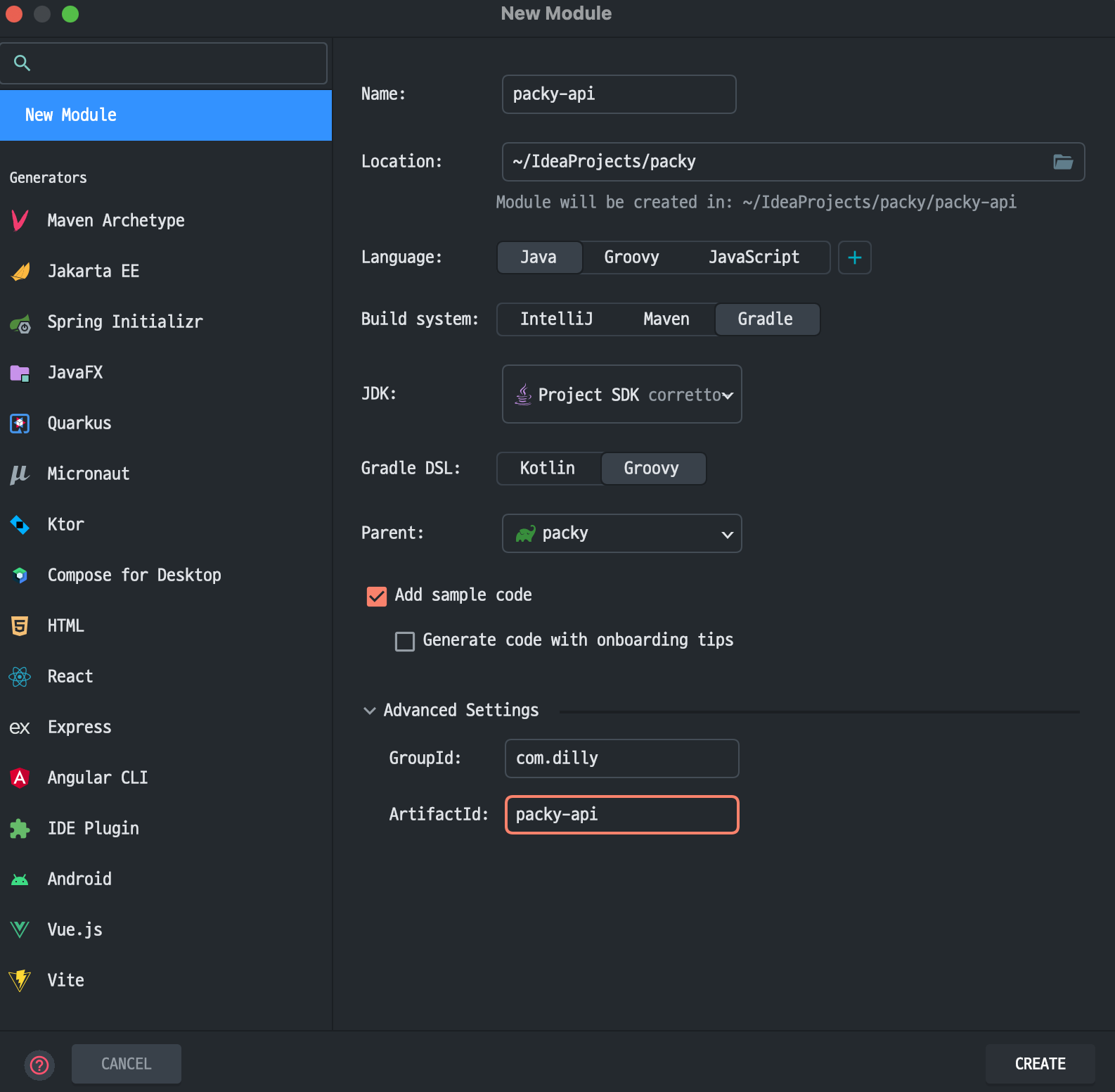 패키지와 모듈이 구분되도록 앞에 프로젝트명을 적어서 모듈을 만들어주었다.