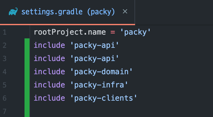 루트 프로젝트를 보면 setting.gradle에 서브 프로젝트(모듈) 정보가 자동으로 기입된 것을 볼 수 있다. 만약 없다면 include '(모듈명)'으로 추가해주자.