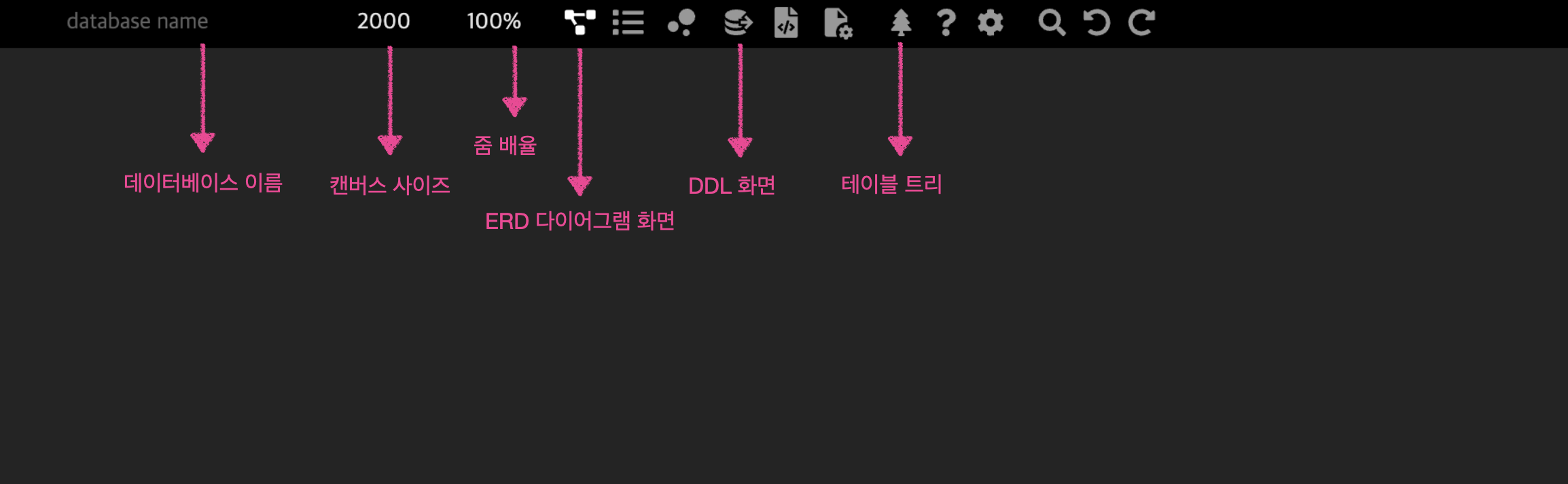 아래와 같이 빈 캔버스가 나온다. 상단 바에서 중요한 아이콘들만 일부 설명을 적어두었다. 마우스를 위에 두면 어떤 기능인지 나오기도 하고 직접 하나씩 눌러보며 기능을 익히자.