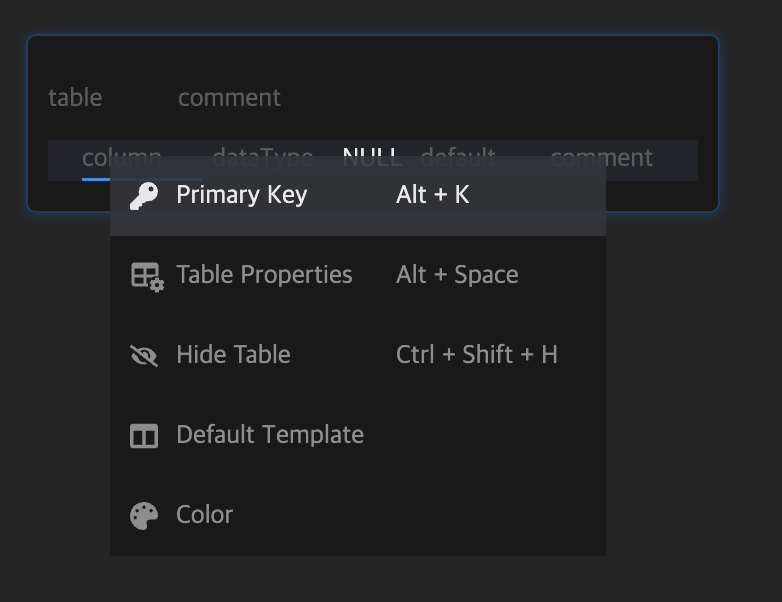 PK 설정은 우클릭 후 Primary Key를 누르거나 Alt + K로 지정할 수 있다.