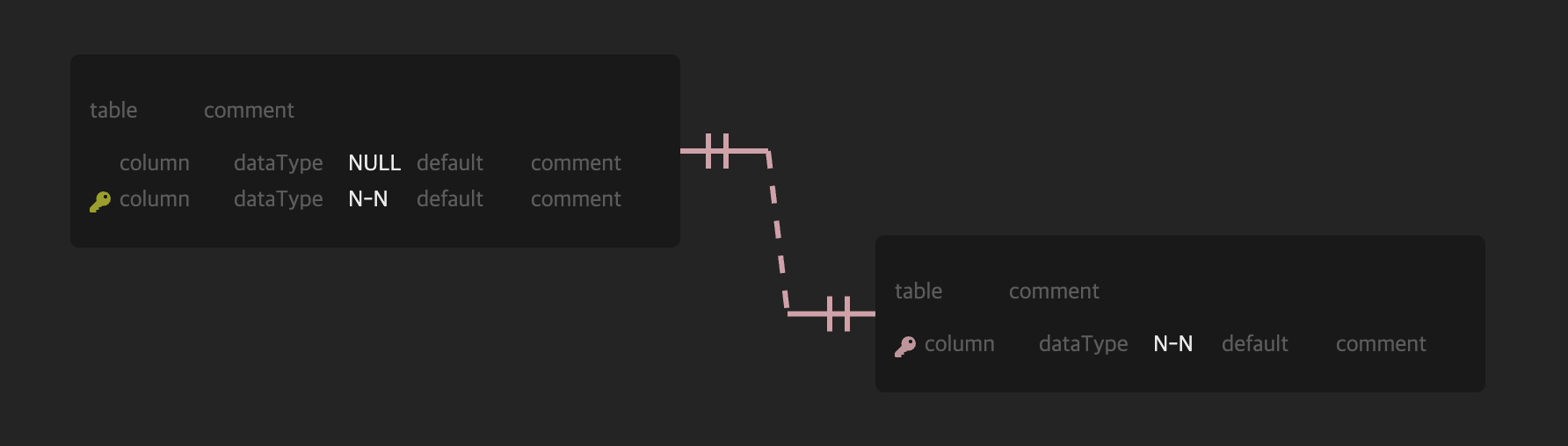 그 후 연관관계를 설정할 두 테이블을 클릭해주면 연관관계가 맺어진다. ERDCloud와 동일하게 식별 관계인지 비식별 관계인지 색깔로 구분이 되고, 연관관계를 설정하면 자동으로 FK와 PK 컬럼이 생긴다.