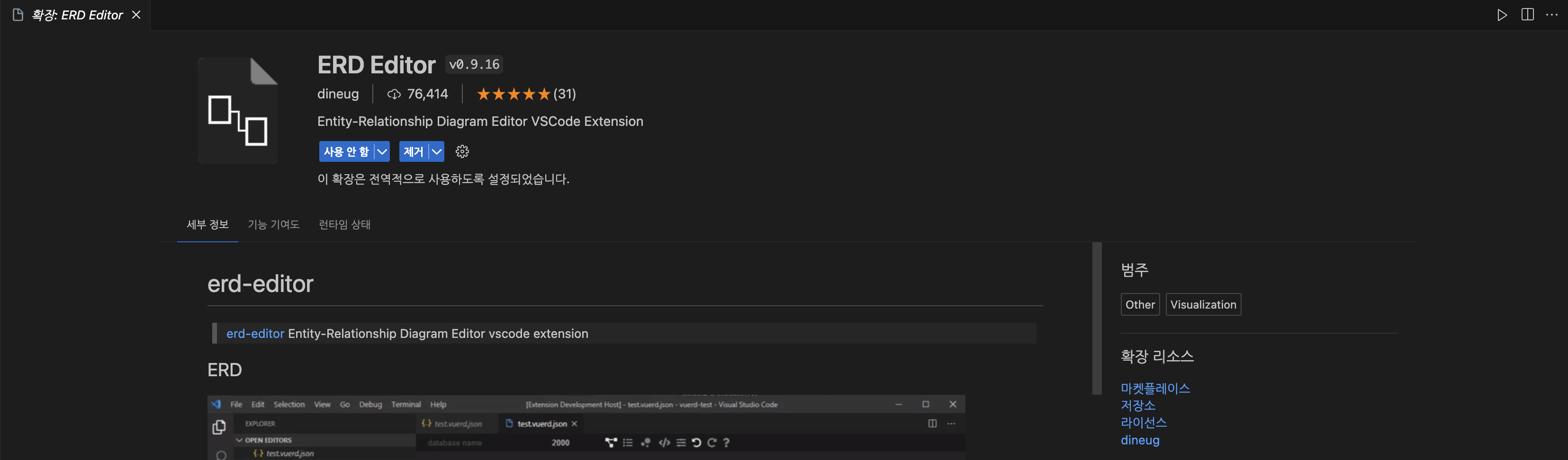 확장 탭에 들어가 'ERD Editor'을 설치해주자.