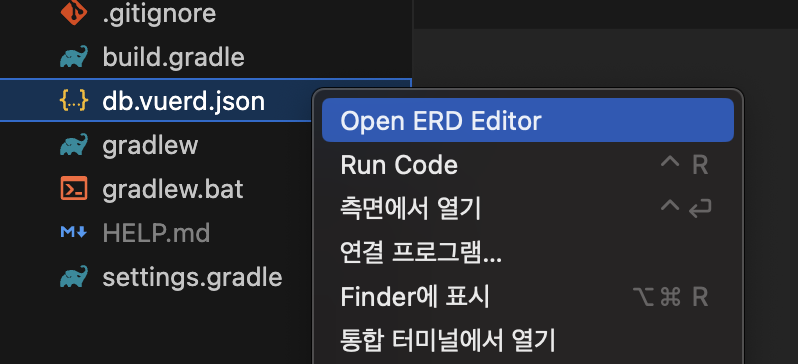 {ERD 이름}.vuerd.json 형식으로 파일을 만들고, 우클릭을 한 다음 'Open ERD Editor'를 눌러 ERD 편집기를 켜준다.