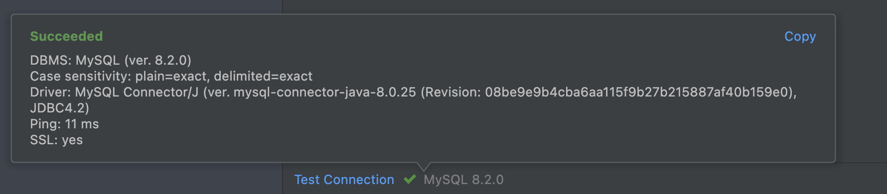 Test Connection을 통해 연결이 잘 된 것을 확인할 수 있다.
