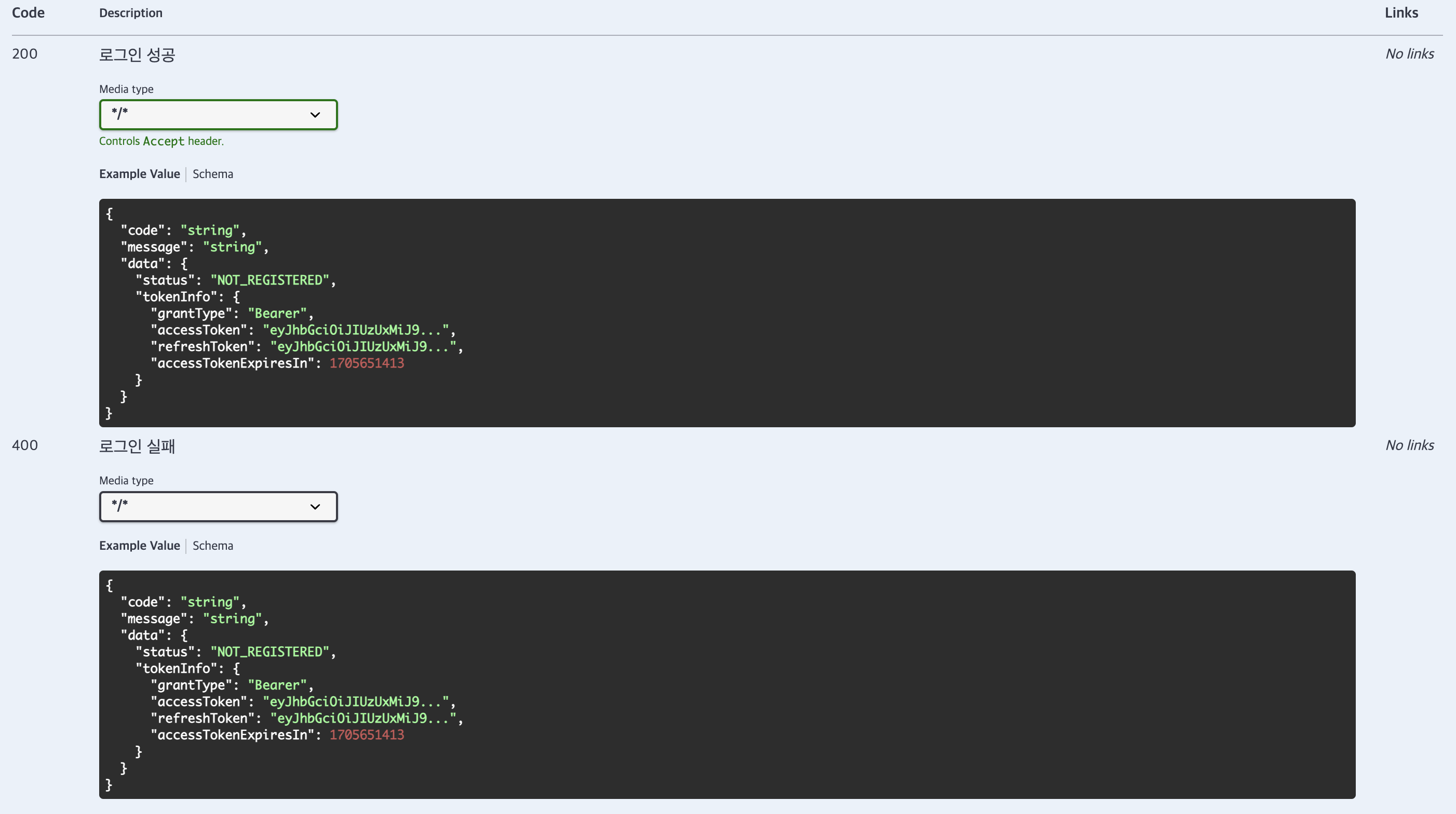 상태 코드가 같은 경우 Examples에서 원하는 에러 상황을 선택하여 각 에러 코드에 맞는 응답값을 볼 수 있다.