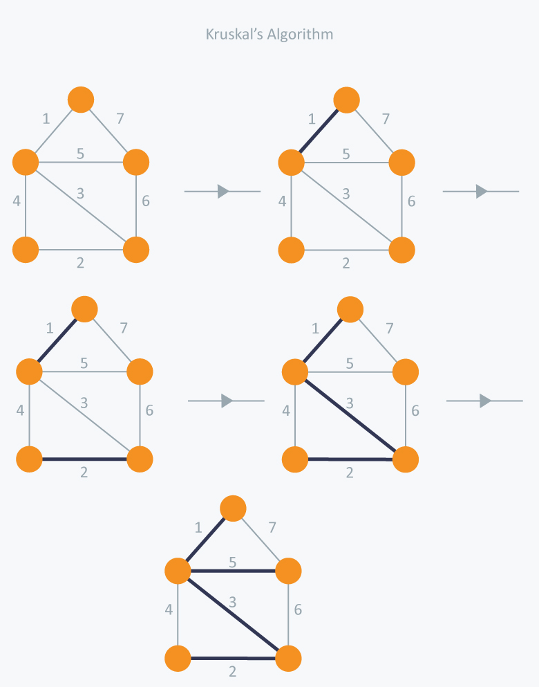 아래 그림을 보면 간선을 작은 것부터 차례대로 고르지만, 4번째 단계에서 4를 선택하면 사이클을 이루기 때문에 5를 선택한다.